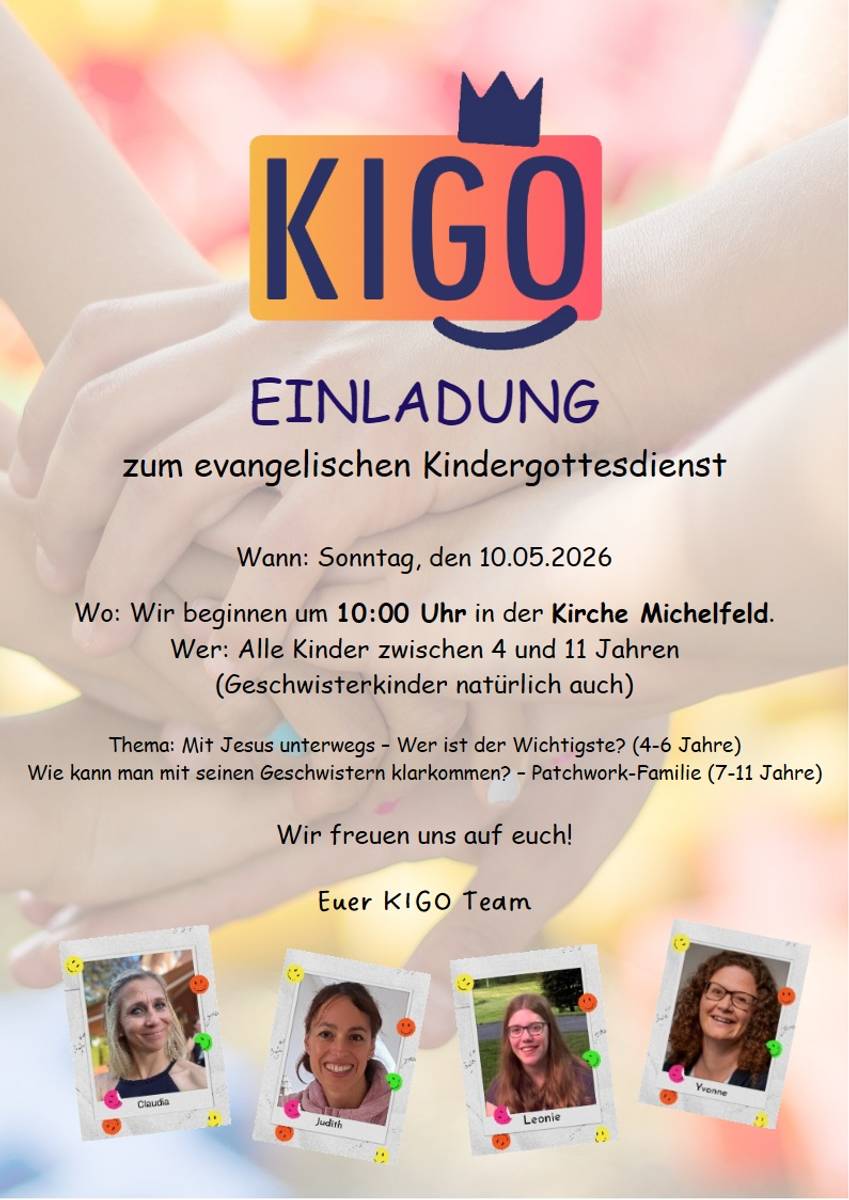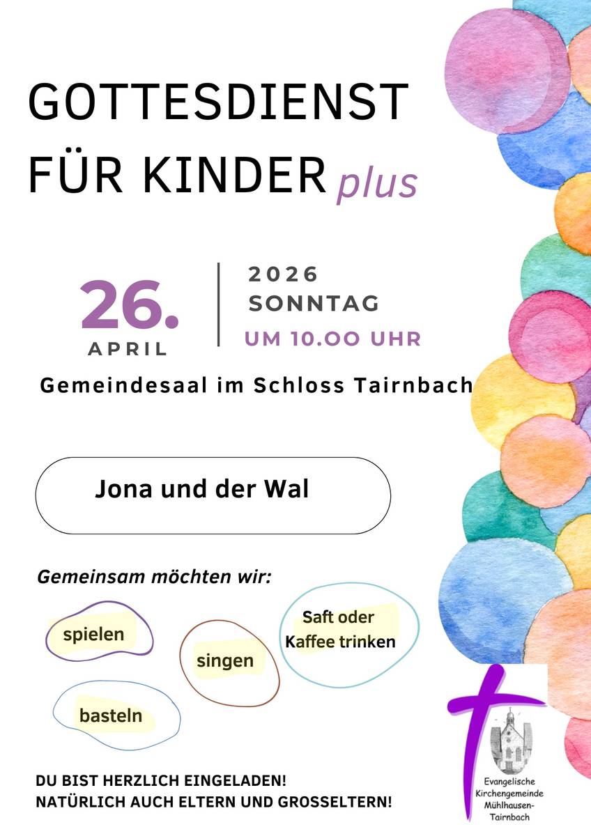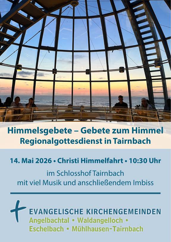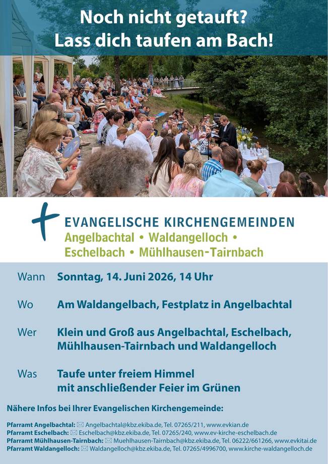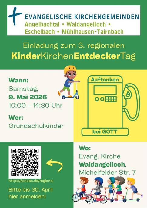 Es ist wieder soweit! – Am Samstag, 9. Mai von 10-14.30 Uhr findet der dritte gemeinsame KinderKirchenEntdeckerTag der Kirchengemeinden Angelbachtal, Eschelbach, Mühlhausen-Tairnbach und Waldangelloch statt. Austragungsort diesmal ist Waldangelloch. Wir starten in der ev. Kirche mit biblischer Geschichte, Anspiel, Liedern und Gebet. Weiter geht es dann mit Stationen am Gemeindehaus und Dorftreff – bei schönem Wetter im Freien – und gemeinsamen Mittagessen, bis zum Abschlussgottesdienst in der Kirche. Thema: "Auftanken bei Gott". Menschen wie der Hirtenjunge David und der König Saul kommen zu Gott in ihrer Freude und in ihrer Not. Sie rufen Gott an im Gebet und bekommen von ihm neue Kraft. Loben, Danken, Klagen, Bitten, Fragen und Verstehen – die Sprache des Gebetes (be)trifft den ganzen Menschen. In diesem Sinne eine herzliche Einladung an alle Kinder im Grundschulalter in unseren Gemeinden.