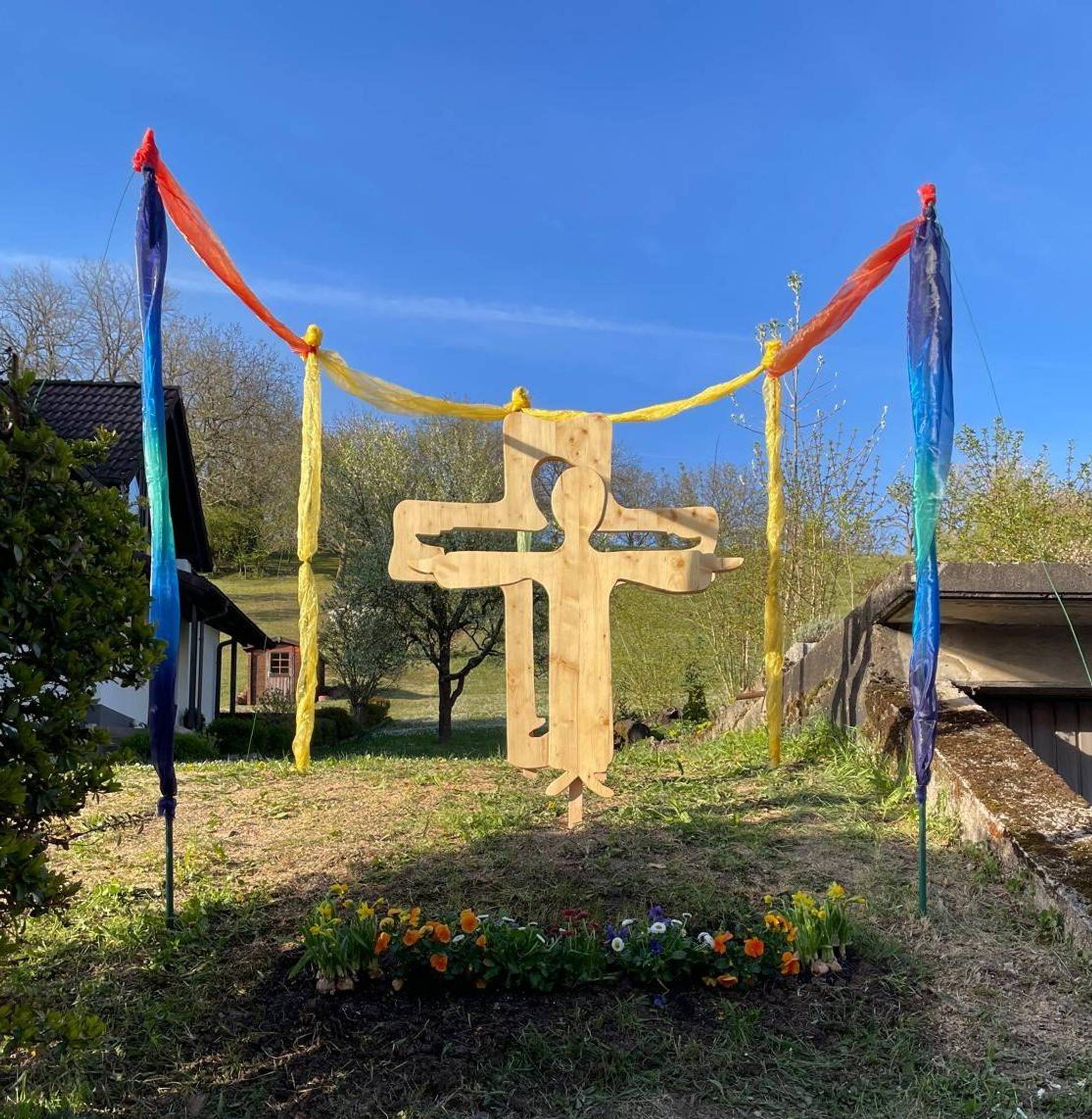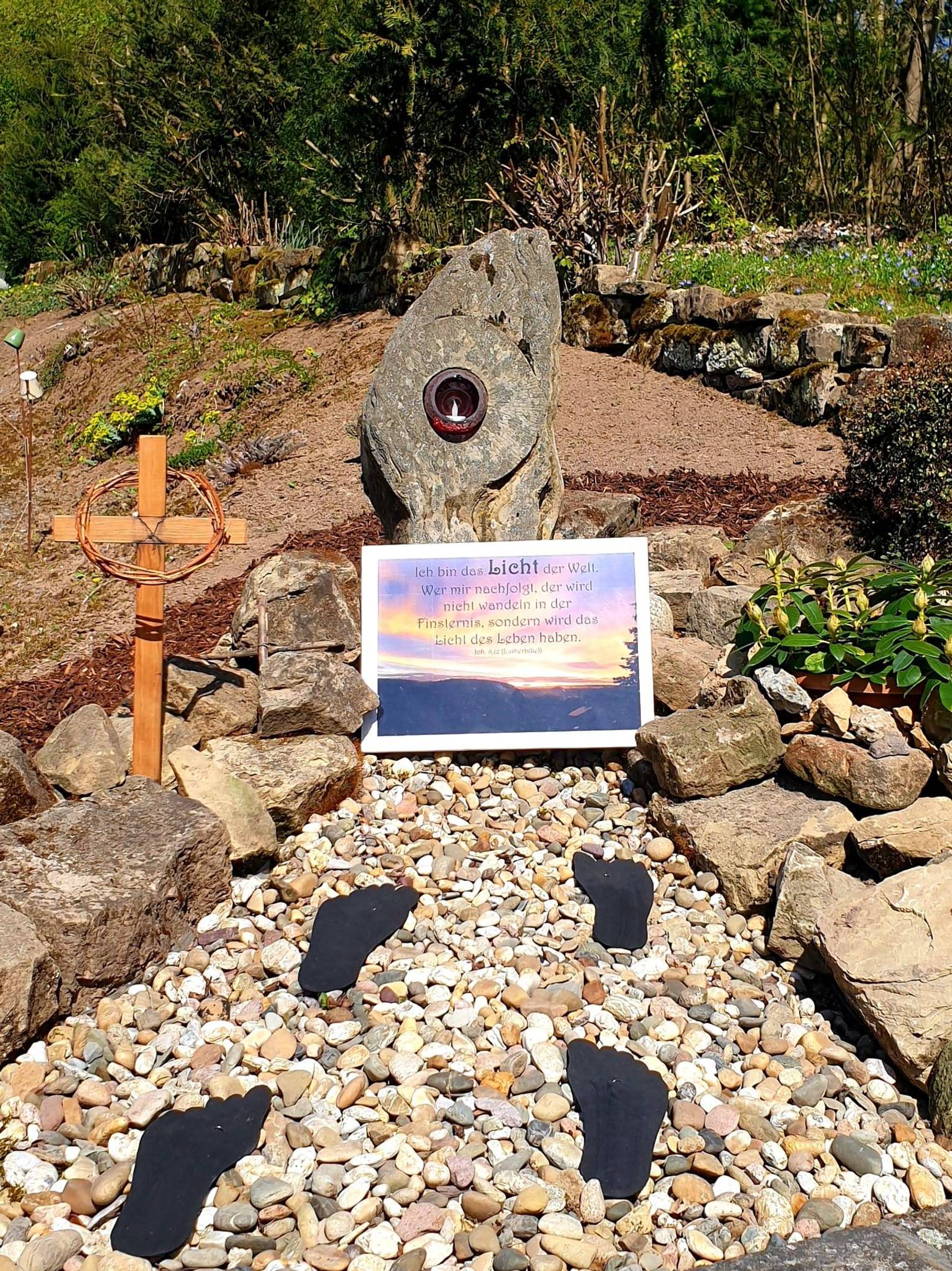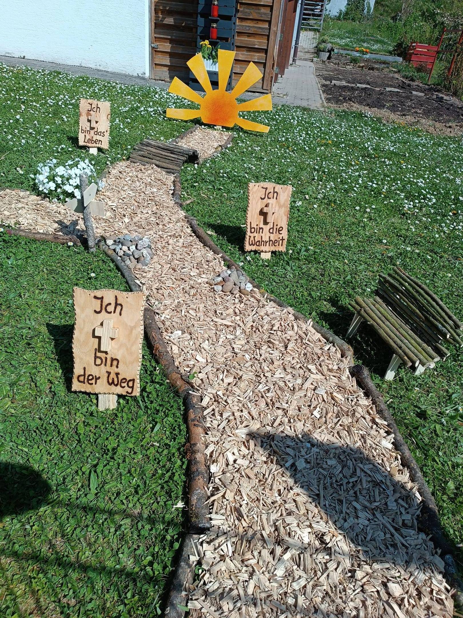 Zum Abschluss des Kreuzweges könnt Ihr Euch entlang der Weinstraße auf die Suche nach diesen „Ich-bin-Worten“ machen. Beim genauen Hinsehen entdeckt Ihr sie vom Gehweg aus in den Gärten.